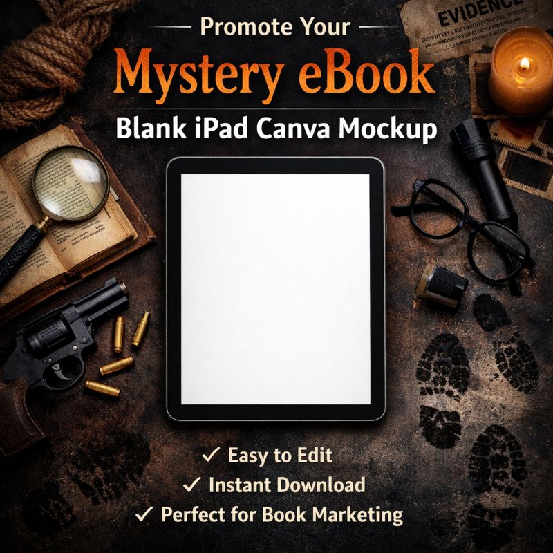 Promote your mystery or thriller eBook using this high-quality blank iPad mockup, specially created for Canva and effortless customization. Just upload your eBook cover, edit in minutes, and design striking visuals perfect for Gumroad, Etsy, WooCommerce, and Bookstagram.